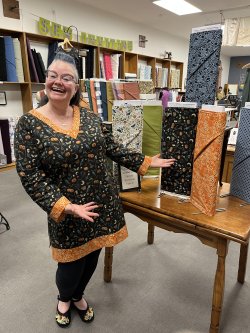 Phoenix has perfected her favorite tunic pattern which means it is a quick make when she sees the right fabric. She chose a Halloween themed black and edged it with an orange and black print. Her super stylish tunic is a testament to how much fun Halloween can be!